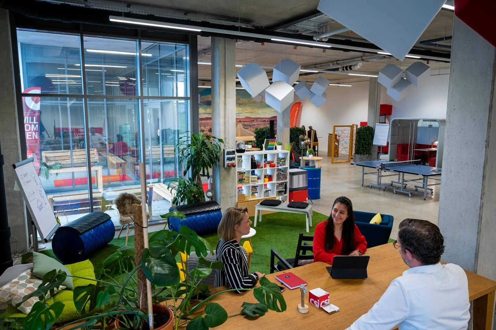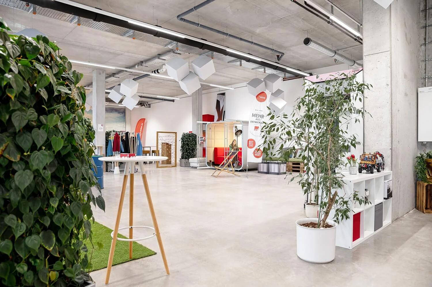 Auf 350 m² inspirierender Fläche mit Wohlfühlfaktor können sich Ideen und kreative Gedanken voll entfalten. Die Größe der Fläche eignet sich einerseits hervorragend für die Präsentation großer Produkte und/oder Fahrzeuge (inkl. großem Rolltor) und kann andererseits flexibel gestaltet werden, um beispielsweise Workshops, Tagungen oder Schulungen durchzuführen. Gerne kannst Du bei uns auch eine Workshopbegleitung buchen und wir unterstützen Dich je nach Bedarf mit einem Moderator oder Veranstaltungskoordinator.